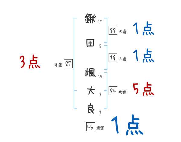 天運![]() | 鍬田颯大良さんの天運は22画の1つ星!努力することが苦手ないっぽう手先が器用。芸術性にも優れる。 家系が持つ宿命的な運勢を表します。祖先から受け継いだ苗字ですので自分の力が及びません。家柄を象徴します。 |