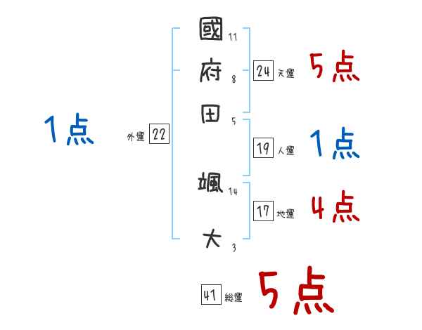 外運![]() | 國府田颯大さんの外運は22画の1つ星!努力することが苦手ないっぽう手先が器用。芸術性にも優れる。 生活面を象徴する運勢です。外部から受ける影響力を表し、結婚運、家庭運や職場、環境への順応性を表します。 |