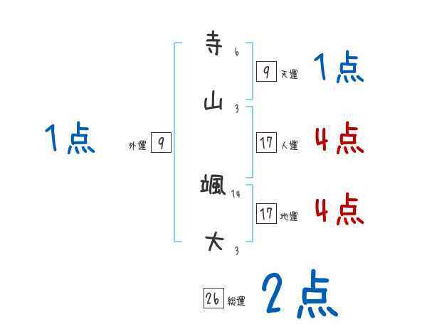 総運![]() | 寺山颯大さんの総運は26画の2つ星!波瀾万丈かも。信頼できる人を大事にしましょう。 あなたの人生を表す1番重要な運勢です。生涯を通じて影響する総合運となり、主に50歳以降の晩年期に影響を及ぼします。 |