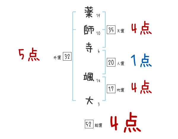 外運![]() | 薬師寺颯大さんの外運は32画の5つ星!柔軟性があり成功する。チャンスが多く金運が良い。 生活面を象徴する運勢です。外部から受ける影響力を表し、結婚運、家庭運や職場、環境への順応性を表します。 |
