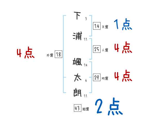 総運![]() | 下浦颯太朗さんの総運は43画の2つ星!頑固な性格で独立心が強いかも。やや非現実的で浪費に注意しましょう。 あなたの人生を表す1番重要な運勢です。生涯を通じて影響する総合運となり、主に50歳以降の晩年期に影響を及ぼします。 |