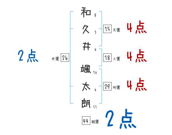 総運![]() | 和久井颯太朗さんの総運は44画の2つ星!誠実で慎重な性格。物事を考えすぎないように注意しましょう。 あなたの人生を表す1番重要な運勢です。生涯を通じて影響する総合運となり、主に50歳以降の晩年期に影響を及ぼします。 |