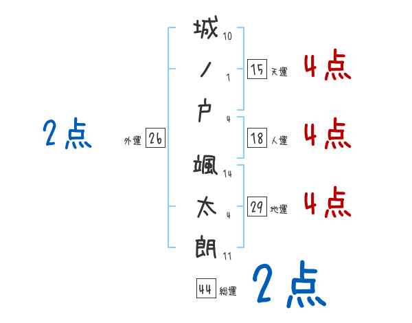 総運![]() | 城ノ戸颯太朗さんの総運は44画の2つ星!誠実で慎重な性格。物事を考えすぎないように注意しましょう。 あなたの人生を表す1番重要な運勢です。生涯を通じて影響する総合運となり、主に50歳以降の晩年期に影響を及ぼします。 |