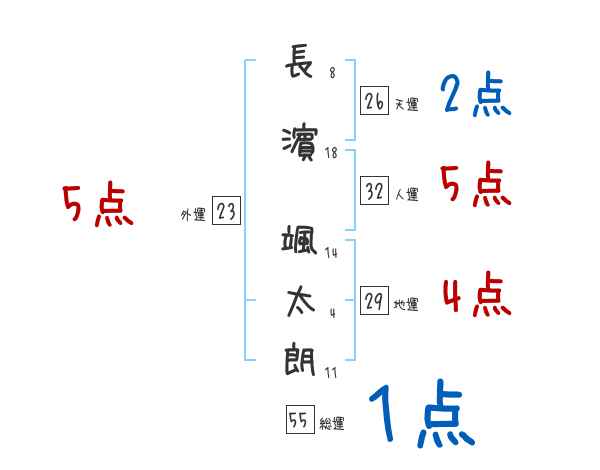 人運![]() | 長濵颯太朗さんの人運は32画の5つ星!柔軟性があり成功する。チャンスが多く金運が良い。 性格や才能などを表す2番目に重要な運勢です。人間関係や協調性、社会的な成功に影響します。主に20歳から50歳ぐらいまでの中年期の運勢を表します。 |
