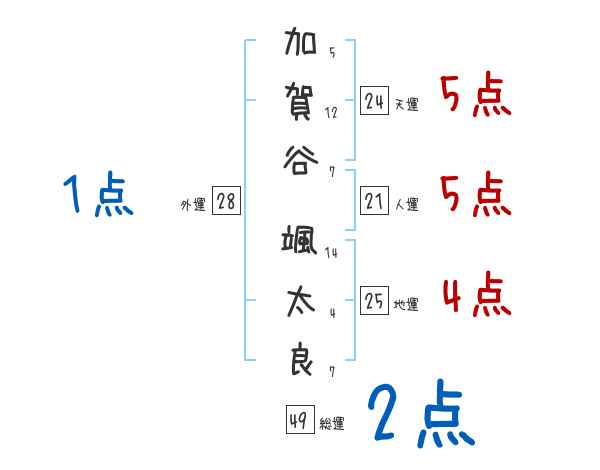 総運![]() | 加賀谷颯太良さんの総運は49画の2つ星!不安定な性格で明暗がある人生。周りの人には支援されやすい。 あなたの人生を表す1番重要な運勢です。生涯を通じて影響する総合運となり、主に50歳以降の晩年期に影響を及ぼします。 |