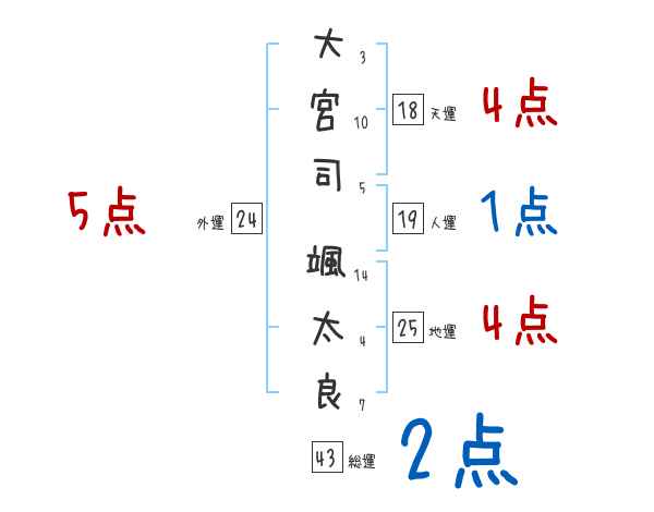 外運![]() | 大宮司颯太良さんの外運は24画の5つ星!家庭運が良く順調な人生。金運にも恵まれる。 生活面を象徴する運勢です。外部から受ける影響力を表し、結婚運、家庭運や職場、環境への順応性を表します。 |