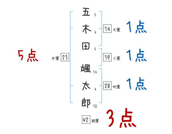 外運![]() | 五木田颯太郎さんの外運は23画の5つ星!想像力に優れ活力がある。一代で成功し名誉を手に入れる。 生活面を象徴する運勢です。外部から受ける影響力を表し、結婚運、家庭運や職場、環境への順応性を表します。 |