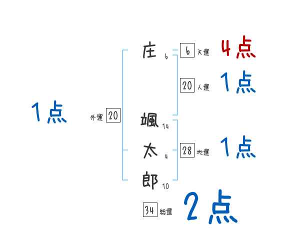総運![]() | 庄颯太郎さんの総運は34画の2つ星!独創性に優れるが、自尊心が強く災難に注意しましょう。 あなたの人生を表す1番重要な運勢です。生涯を通じて影響する総合運となり、主に50歳以降の晩年期に影響を及ぼします。 |