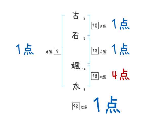 総運![]() | 古石颯太さんの総運は28画の1つ星!家庭環境に注意。スポーツで活躍できる能力があるかも。 あなたの人生を表す1番重要な運勢です。生涯を通じて影響する総合運となり、主に50歳以降の晩年期に影響を及ぼします。 |