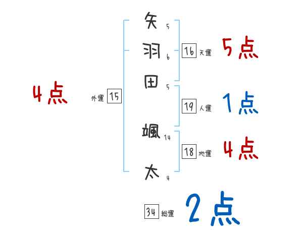 総運![]() | 矢羽田颯太さんの総運は34画の2つ星!独創性に優れるが、自尊心が強く災難に注意しましょう。 あなたの人生を表す1番重要な運勢です。生涯を通じて影響する総合運となり、主に50歳以降の晩年期に影響を及ぼします。 |