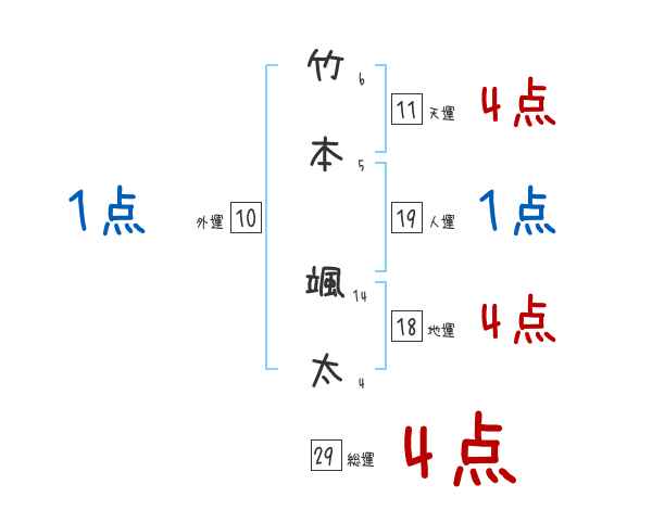 天運![]() | 竹本颯太さんの天運は11画の4つ星!着実に富や地位を得る幸運な人生。 家系が持つ宿命的な運勢を表します。祖先から受け継いだ苗字ですので自分の力が及びません。家柄を象徴します。 |