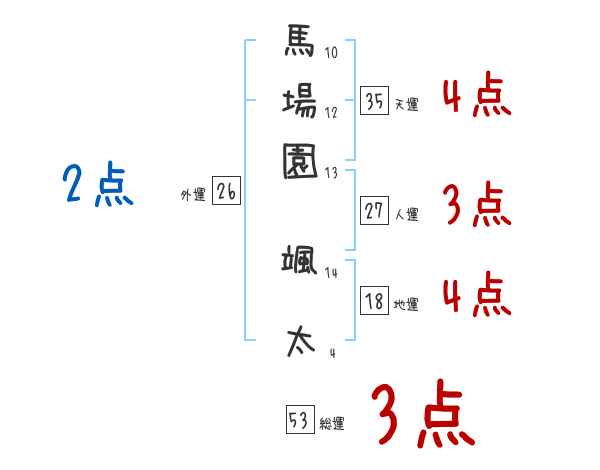 天運![]() | 馬場園颯太さんの天運は35画の4つ星!温厚な性格で感受性が高い。穏和な性格で人望が厚い。 家系が持つ宿命的な運勢を表します。祖先から受け継いだ苗字ですので自分の力が及びません。家柄を象徴します。 |