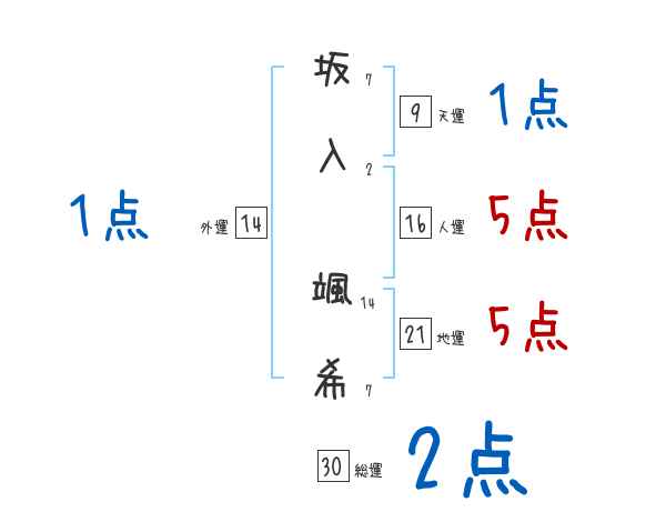 外運![]() | 坂入颯希さんの外運は14画の1つ星!人に対して優しいがストレスを溜め込みがち。人間関係のトラブルを避けるよう気をつけましょう。 生活面を象徴する運勢です。外部から受ける影響力を表し、結婚運、家庭運や職場、環境への順応性を表します。 |