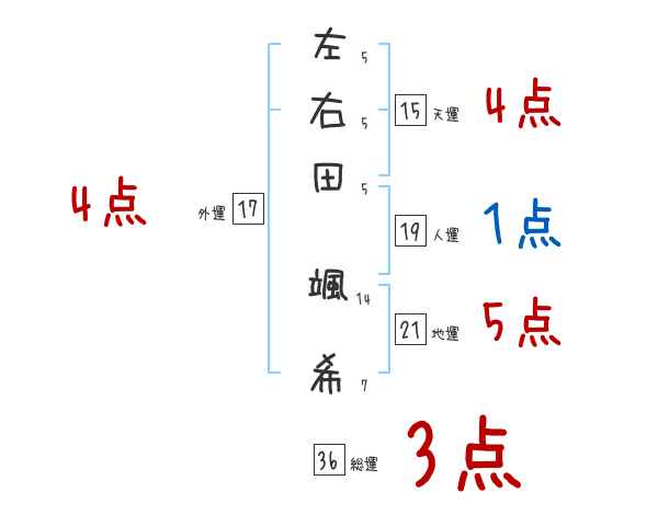 外運![]() | 左右田颯希さんの外運は17画の4つ星!積極的な行動力。地位を気づき財産を手に入れる。純粋な心と直感力。 生活面を象徴する運勢です。外部から受ける影響力を表し、結婚運、家庭運や職場、環境への順応性を表します。 |