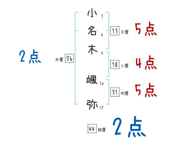 外運![]() | 小名木颯弥さんの外運は26画の2つ星!波瀾万丈かも。信頼できる人を大事にしましょう。 生活面を象徴する運勢です。外部から受ける影響力を表し、結婚運、家庭運や職場、環境への順応性を表します。 |