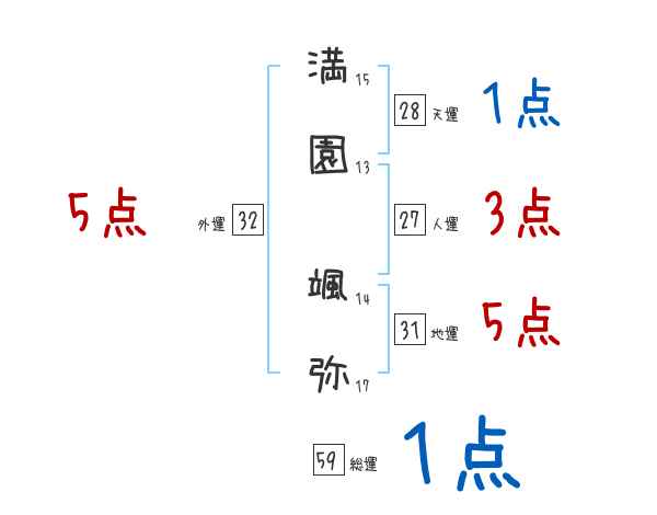天運![]() | 満園颯弥さんの天運は28画の1つ星!家庭環境に注意。スポーツで活躍できる能力があるかも。 家系が持つ宿命的な運勢を表します。祖先から受け継いだ苗字ですので自分の力が及びません。家柄を象徴します。 |