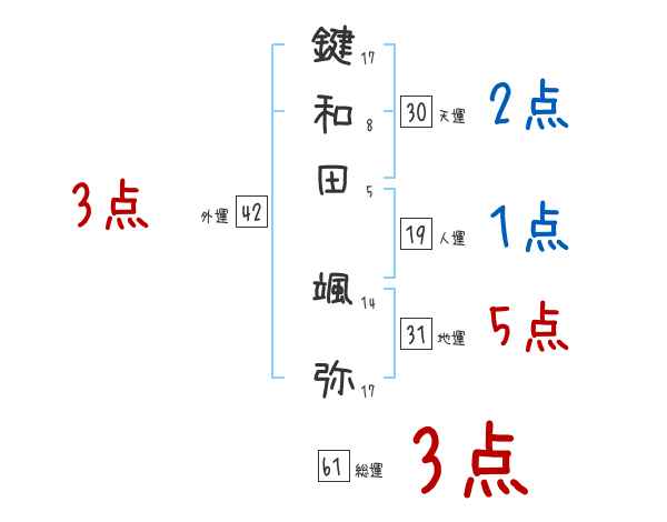 外運![]() | 鍵和田颯弥さんの外運は42画の3つ星!病気に注意。多芸であるが消極的でおとなしい。 生活面を象徴する運勢です。外部から受ける影響力を表し、結婚運、家庭運や職場、環境への順応性を表します。 |
