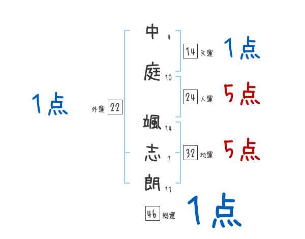 天運![]() | 中庭颯志朗さんの天運は14画の1つ星!人に対して優しいがストレスを溜め込みがち。人間関係のトラブルを避けるよう気をつけましょう。 家系が持つ宿命的な運勢を表します。祖先から受け継いだ苗字ですので自分の力が及びません。家柄を象徴します。 |