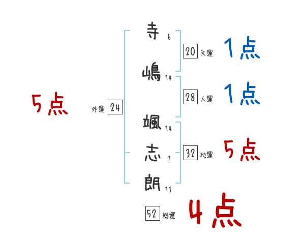 外運![]() | 寺嶋颯志朗さんの外運は24画の5つ星!家庭運が良く順調な人生。金運にも恵まれる。 生活面を象徴する運勢です。外部から受ける影響力を表し、結婚運、家庭運や職場、環境への順応性を表します。 |