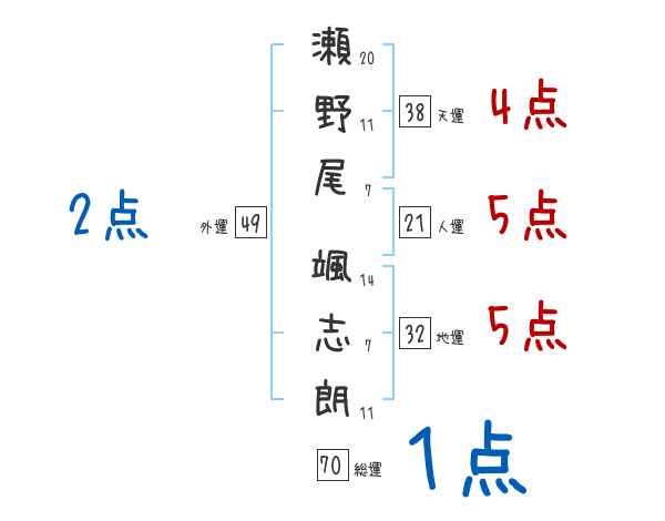 地運![]() | 瀬野尾颯志朗さんの地運は32画の5つ星!柔軟性があり成功する。チャンスが多く金運が良い。 個性を表す基礎的な運勢です。性格形成や対人関係、行動力など家庭環境に影響されます。主に誕生してから20歳くらいまでの若年期の運勢を表します。 |