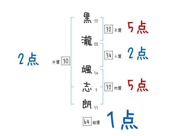 天運![]() | 黒瀧颯志朗さんの天運は32画の5つ星!柔軟性があり成功する。チャンスが多く金運が良い。 家系が持つ宿命的な運勢を表します。祖先から受け継いだ苗字ですので自分の力が及びません。家柄を象徴します。 |
