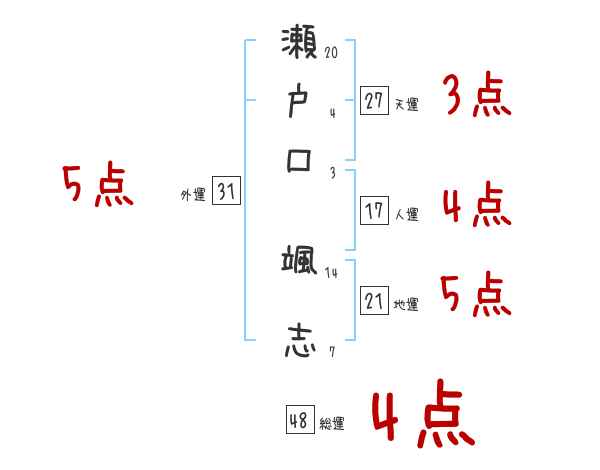 外運![]() | 瀬戸口颯志さんの外運は31画の5つ星!社交性があり判断力に優れる。順風満帆な人生で円満な生活。 生活面を象徴する運勢です。外部から受ける影響力を表し、結婚運、家庭運や職場、環境への順応性を表します。 |