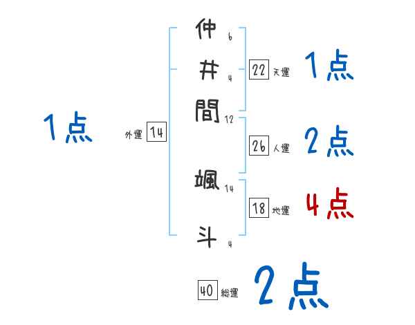 外運![]() | 仲井間颯斗さんの外運は14画の1つ星!人に対して優しいがストレスを溜め込みがち。人間関係のトラブルを避けるよう気をつけましょう。 生活面を象徴する運勢です。外部から受ける影響力を表し、結婚運、家庭運や職場、環境への順応性を表します。 |