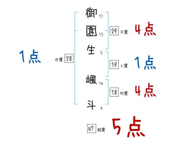 総運![]() | 御園生颯斗さんの総運は47画の5つ星!実力が開花し発展する円満な人生。財に恵まれる。 あなたの人生を表す1番重要な運勢です。生涯を通じて影響する総合運となり、主に50歳以降の晩年期に影響を及ぼします。 |