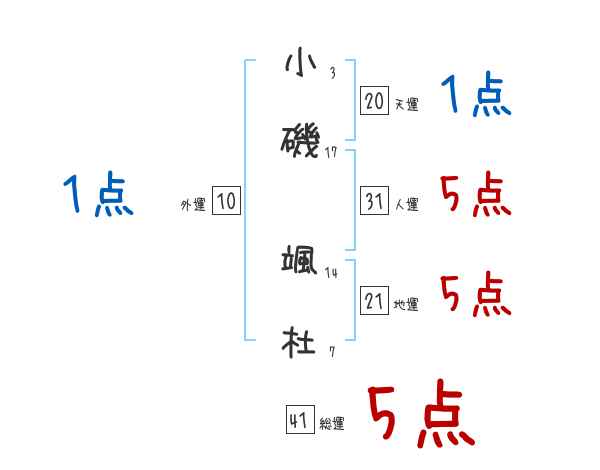 総運![]() | 小磯颯杜さんの総運は41画の5つ星!大志を抱き、目標に向かって実力を発揮し達成する。温和な性格。 あなたの人生を表す1番重要な運勢です。生涯を通じて影響する総合運となり、主に50歳以降の晩年期に影響を及ぼします。 |