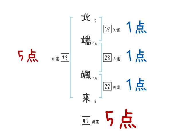 外運![]() | 北端颯来さんの外運は13画の5つ星!才能に恵まれ人気がある。名声を手に入れる。円満な人生。 生活面を象徴する運勢です。外部から受ける影響力を表し、結婚運、家庭運や職場、環境への順応性を表します。 |