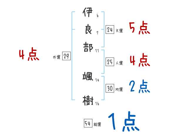 外運![]() | 伊良部颯樹さんの外運は29画の4つ星!完全主義で才能がある。厳格な心の持ち主。 生活面を象徴する運勢です。外部から受ける影響力を表し、結婚運、家庭運や職場、環境への順応性を表します。 |