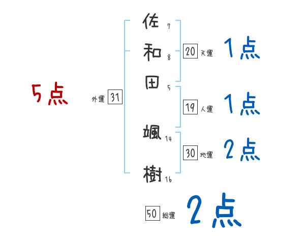 外運![]() | 佐和田颯樹さんの外運は31画の5つ星!社交性があり判断力に優れる。順風満帆な人生で円満な生活。 生活面を象徴する運勢です。外部から受ける影響力を表し、結婚運、家庭運や職場、環境への順応性を表します。 |
