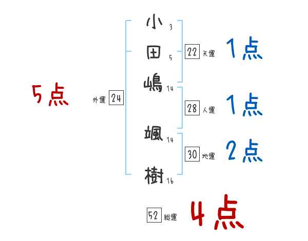 外運![]() | 小田嶋颯樹さんの外運は24画の5つ星!家庭運が良く順調な人生。金運にも恵まれる。 生活面を象徴する運勢です。外部から受ける影響力を表し、結婚運、家庭運や職場、環境への順応性を表します。 |