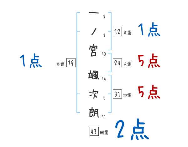 総運![]() | 一ノ宮颯次朗さんの総運は43画の2つ星!頑固な性格で独立心が強いかも。やや非現実的で浪費に注意しましょう。 あなたの人生を表す1番重要な運勢です。生涯を通じて影響する総合運となり、主に50歳以降の晩年期に影響を及ぼします。 |