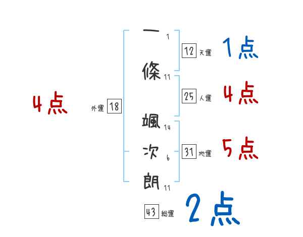 総運![]() | 一條颯次朗さんの総運は43画の2つ星!頑固な性格で独立心が強いかも。やや非現実的で浪費に注意しましょう。 あなたの人生を表す1番重要な運勢です。生涯を通じて影響する総合運となり、主に50歳以降の晩年期に影響を及ぼします。 |