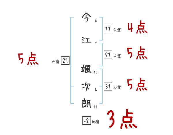 外運![]() | 今江颯次朗さんの外運は21画の5つ星!統率力がある。独立し成功する。名誉を手に入れる。 生活面を象徴する運勢です。外部から受ける影響力を表し、結婚運、家庭運や職場、環境への順応性を表します。 |