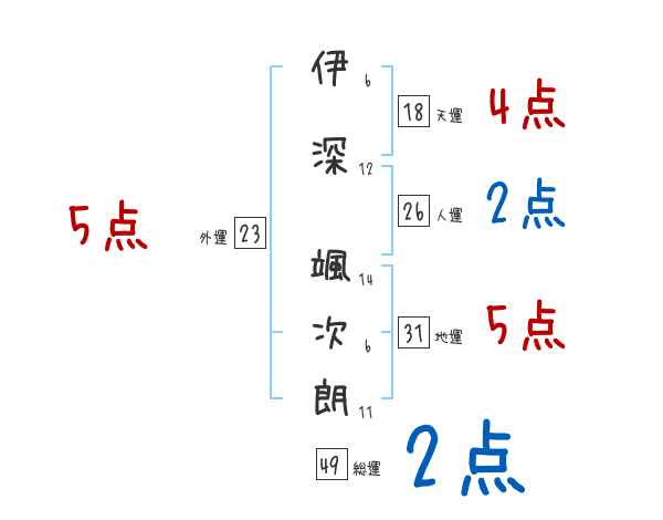 外運![]() | 伊深颯次朗さんの外運は23画の5つ星!想像力に優れ活力がある。一代で成功し名誉を手に入れる。 生活面を象徴する運勢です。外部から受ける影響力を表し、結婚運、家庭運や職場、環境への順応性を表します。 |