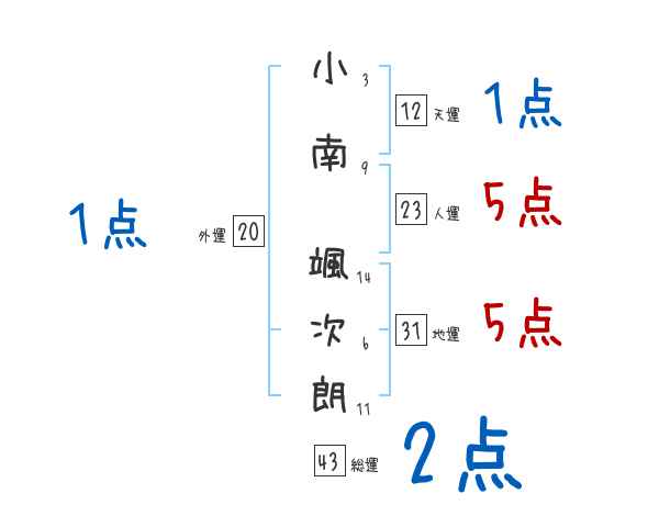 人運![]() | 小南颯次朗さんの人運は23画の5つ星!想像力に優れ活力がある。一代で成功し名誉を手に入れる。 性格や才能などを表す2番目に重要な運勢です。人間関係や協調性、社会的な成功に影響します。主に20歳から50歳ぐらいまでの中年期の運勢を表します。 |