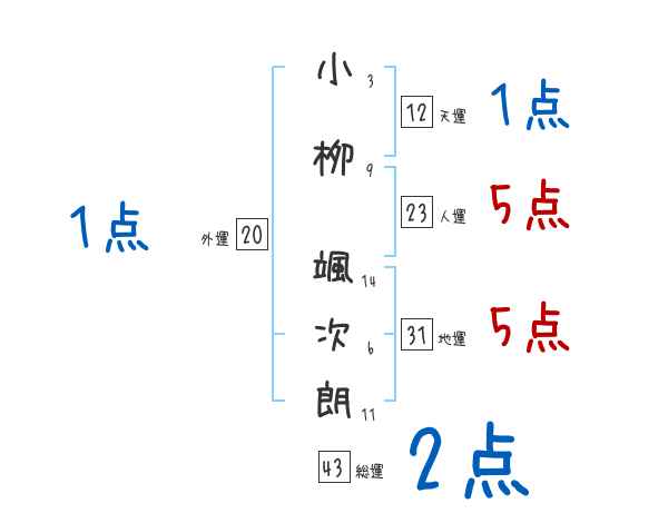 総運![]() | 小栁颯次朗さんの総運は43画の2つ星!頑固な性格で独立心が強いかも。やや非現実的で浪費に注意しましょう。 あなたの人生を表す1番重要な運勢です。生涯を通じて影響する総合運となり、主に50歳以降の晩年期に影響を及ぼします。 |
