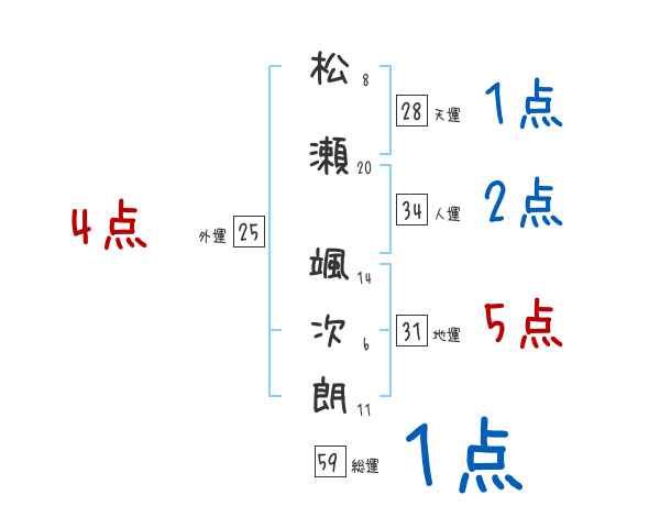 天運![]() | 松瀬颯次朗さんの天運は28画の1つ星!家庭環境に注意。スポーツで活躍できる能力があるかも。 家系が持つ宿命的な運勢を表します。祖先から受け継いだ苗字ですので自分の力が及びません。家柄を象徴します。 |