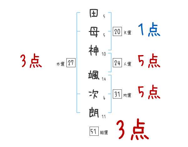 総運![]() | 田母神颯次朗さんの総運は51画の3つ星!変化が激しく、危険に注意。堅実な性格。 あなたの人生を表す1番重要な運勢です。生涯を通じて影響する総合運となり、主に50歳以降の晩年期に影響を及ぼします。 |