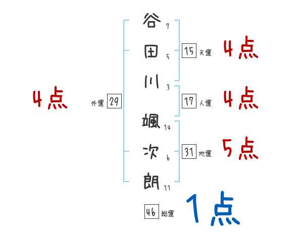 総運![]() | 谷田川颯次朗さんの総運は46画の1つ星!迷走することが多く苦労するかも。目先のことにとらわれないように。 あなたの人生を表す1番重要な運勢です。生涯を通じて影響する総合運となり、主に50歳以降の晩年期に影響を及ぼします。 |