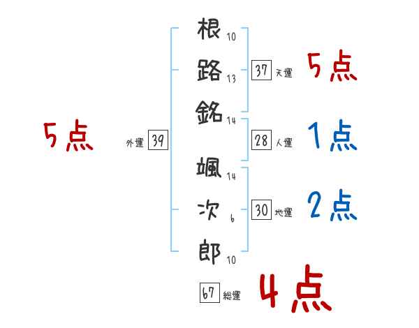 外運![]() | 根路銘颯次郎さんの外運は39画の5つ星!社交性に優れ人望が厚い。人の上に立ち成功する。 生活面を象徴する運勢です。外部から受ける影響力を表し、結婚運、家庭運や職場、環境への順応性を表します。 |