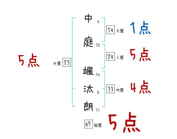 外運![]() | 中庭颯汰朗さんの外運は23画の5つ星!想像力に優れ活力がある。一代で成功し名誉を手に入れる。 生活面を象徴する運勢です。外部から受ける影響力を表し、結婚運、家庭運や職場、環境への順応性を表します。 |