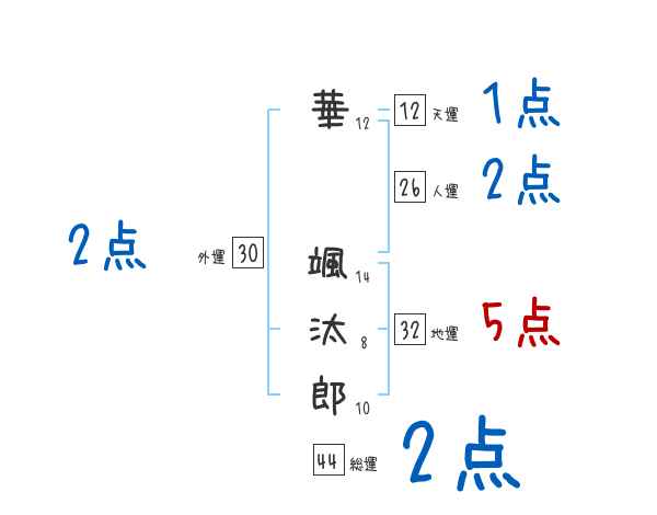 総運![]() | 華颯汰郎さんの総運は44画の2つ星!誠実で慎重な性格。物事を考えすぎないように注意しましょう。 あなたの人生を表す1番重要な運勢です。生涯を通じて影響する総合運となり、主に50歳以降の晩年期に影響を及ぼします。 |