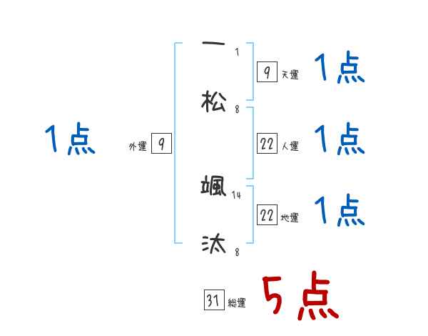 総運![]() | 一松颯汰さんの総運は31画の5つ星!社交性があり判断力に優れる。順風満帆な人生で円満な生活。 あなたの人生を表す1番重要な運勢です。生涯を通じて影響する総合運となり、主に50歳以降の晩年期に影響を及ぼします。 |