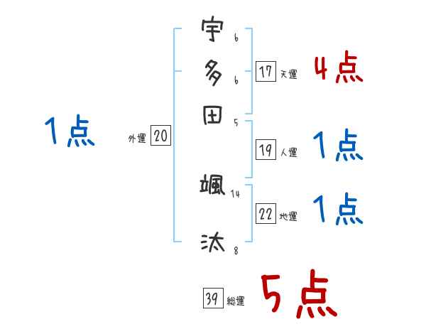天運![]() | 宇多田颯汰さんの天運は17画の4つ星!積極的な行動力。地位を気づき財産を手に入れる。純粋な心と直感力。 家系が持つ宿命的な運勢を表します。祖先から受け継いだ苗字ですので自分の力が及びません。家柄を象徴します。 |