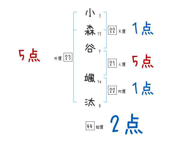 天運![]() | 小森谷颯汰さんの天運は22画の1つ星!努力することが苦手ないっぽう手先が器用。芸術性にも優れる。 家系が持つ宿命的な運勢を表します。祖先から受け継いだ苗字ですので自分の力が及びません。家柄を象徴します。 |