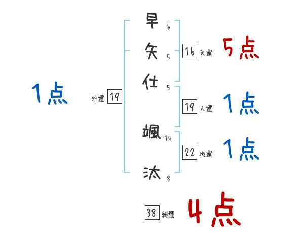 天運![]() | 早矢仕颯汰さんの天運は16画の5つ星!人望が厚く大きく発展する。逆転成功が見える。 家系が持つ宿命的な運勢を表します。祖先から受け継いだ苗字ですので自分の力が及びません。家柄を象徴します。 |