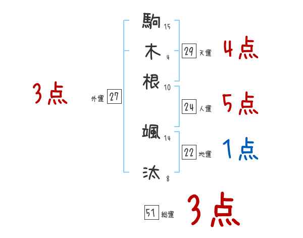 外運![]() | 駒木根颯汰さんの外運は27画の3つ星!頭脳明晰だが強情で摩擦が多い傾向。孤立に注意。 生活面を象徴する運勢です。外部から受ける影響力を表し、結婚運、家庭運や職場、環境への順応性を表します。 |